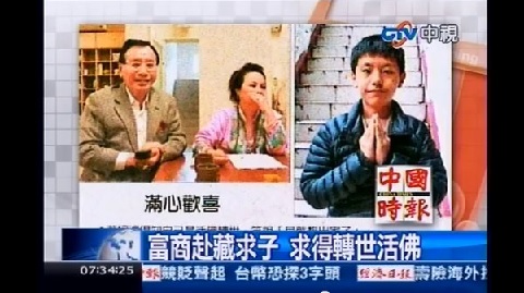 中国台湾网4月8日消息 据台湾今日新闻网报道,台湾富商蔡友文、尤黎珠夫妇在香港和东南亚经商致富,两人求子多年不可得。夫妇两人到一家妇产科看诊,医师告知夫人尤黎珠不可能再怀孕,因此断了求子的念头。夫妇俩1999年赴西藏大昭寺在佛前发愿,希望得子,并许愿若得子将会供养儿子出家弘扬佛法。没想到两人返台后,尤黎珠竟怀孕了,而且在经80岁的玛贡仁波切认定,今年已经13岁的蔡经濠是活佛转世。