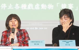台湾动物研究会主任陈玉敏(左)与台湾蛮野心足生态协会秘书长林子凌(右),昨天看到原住民在祭典中的“抓鸡”与“抓猪”画面,忍不住落泪。图片来自台湾《联合报》