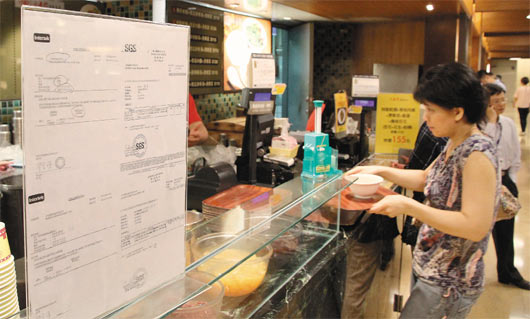 台北市府卫生局昨天首波针对有贩卖与供应粄条、肉圆等八大类产品的餐饮业,辅导业者在明显处张贴安全证明,让消费者安心。图片来源:台湾《联合报》