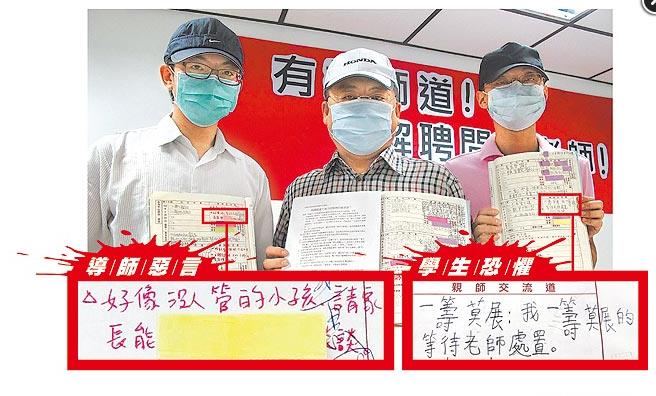 昨天3名家长在人本基金会陪同下开记者会,但3人怕身分曝光影响小孩,全程戴口罩,他们自嘲:“很没种!学期结束才敢开记者会。”3人列举廖姓男导师诸多不当管教实例,包括在家庭联络簿上称学生“好像没人管的小孩”、骂学生“过动儿、吃药了没?”当学生面前骂学生的妈妈是“白痴”等。