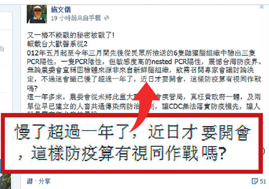 台大立即在6月24日通报台“防检局”、26日将检体送往家卫所;上周该份监测报告提前曝光,却一直碍于三只鼬獾没有“新鲜的脑”,导致最后的“免疫荧光抗体染色法”无法进行,迟迟难以判定。
