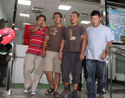 杨儒门(右2),18日傍晚与1名友人涉嫌在马英九办公室前泼油漆。台湾警方获报后将他们带回警局侦讯,晚间9时15分左右移送。(图片来自台媒)