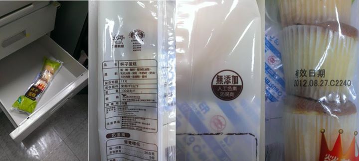 洪浩云表示,某天他在值班室休息的时候很无聊,于是翻翻柜子找找抽屉,想找点东西看看,然后在抽屉里发现了杯子蛋糕。刚好肚子饿了,正想吃的时候,瞄到了它的保存期限:2012.08.27,过期了快一年。“我当下整个人精神来了,仔细看着这包未拆封的蛋糕,有趣!”