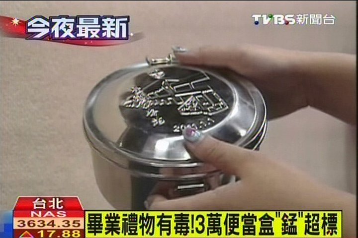中国台湾网8月1日消息 据台湾TVBS电视台报道,为庆祝幼儿园学生毕业,新北市府发给3万名学童,一人一个不锈钢便当盒当礼物,结果被测出锰含量超标5倍。