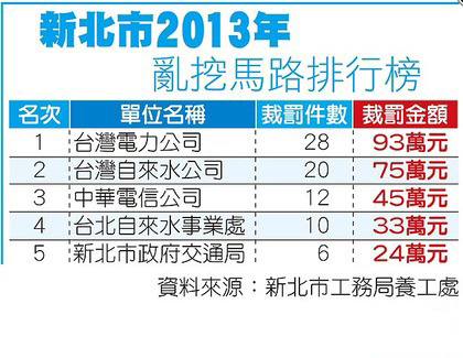 新北市2013年乱挖马路排行榜。(单位:新台币,图片取自台媒)