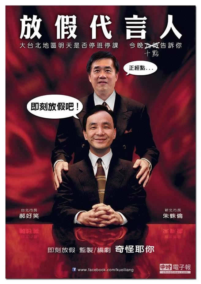 中国台湾网8月20日消息 据台湾《中国时报》报道,台风“潭美”夹带丰沛雨量进袭台湾,究竟要不要放假,要看各县市一把手的一道命令。台湾网友殷切期盼,模仿知名电影《魔鬼代言人》海报里的基努·里维斯和艾尔帕西诺二人,KUSO郝龙斌、朱立伦,希望台风假快些来临。