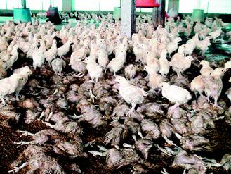 鸡舍内布满死鸡尸体,残存的鸡就踩在死鸡上瑟缩发抖;林正松说,这四万多只鸡再一个多月就能卖钱,现在全都没了。