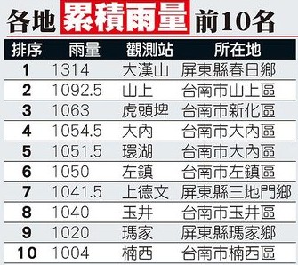 台湾各地累积雨量前10名。(图片来自台媒)