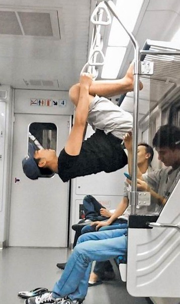 台湾火车一外国劳工上演“拉环体操”,让同车乘客吓了一跳。(图片来自台媒)