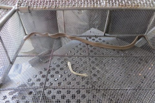 消防人员不知道蛇的品种和大小,于是小心翼翼的打开书包,果真看到一条大约30公分、不知名的蛇躲在书包底部,迅速用手把蛇抓起来,关进笼子里,解除一场虚惊。