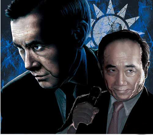 接下来9月13日又以“灭王计划大曝光”为题作画。图中“马英九”手持双枪,佩戴“司法正义”臂章,神情冷峻,目指王金平。两侧“江宜桦”、“罗智强”执暗器向王发难。而王手拿国民党考纪会处理报告作低头沉思状,似在考虑后招。
