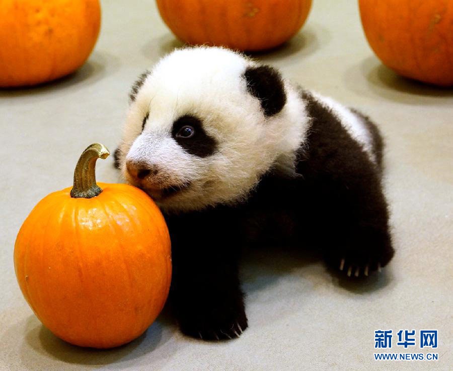10月12日,正在学走路的“圆仔”在一个南瓜旁驻足