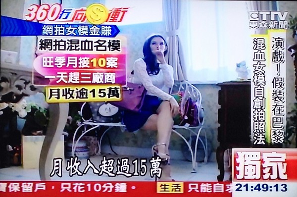 身高170公分的Sora林酉芯,虽然有四分之一荷兰血统,却是正港台湾人,入行3年现在是超抢手的网拍界混血名模,要找她拍照一年前就要开始敲通告。碰到旺季,Sora一个月有十几个活动,一天要连赶3场,月收入超过15万元。 图片来源:台媒