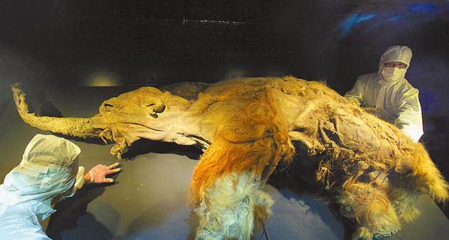 2010年出土,冰封在西伯利亚永冻层3万9000年的实体长毛象遗骸YUKA,是全球第1头完整出土的幼年雌象,四肢完整,带有毛发,还保有完整的大脑组织。展览中,观众除了会看见在零下15℃冷冻柜中的YUKA,还将同时目睹2007年出土的完整披毛犀牛遗骸KOLYMA的真容,以及来自西伯利亚超过200件冰原世界巨兽的原貌展品。