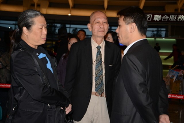 台湾民众许立民在马来西亚遇害,妻子张安薇遭绑下落不明。张的哥哥张大公(左)与许立民二哥(中)等人,19日搭机前往沙巴,处理相关事宜,但相当低调。(台媒图)