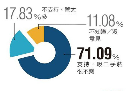 台媒针对“有民众抱怨等红灯常有机车骑士抽烟,‘卫福部’研拟十字路口禁烟,请问你支持吗?”进行民调,460份有效样本中,有71.09%民众表示支持,认为吸二手烟很不爽;17.83%民众不支持,认为当局坑钱、管太多;11.08%民众没意见。(中国台湾网 高旭)