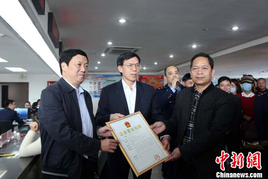 12月2日,平潭工商管理部门向台商薛清德颁发改革后首本《企业营业执照》。中新社发 郭熙婵 摄
