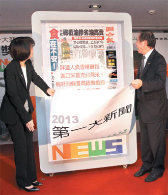 台湾《联合报》与张荣发基金会“票选2013第一大新闻”结果昨揭晓。张荣发基金会执行长聂国维(右)、联合报总编辑游美月(左)公布第一大新闻为假油等食安新闻。图片来源:台湾《联合报》