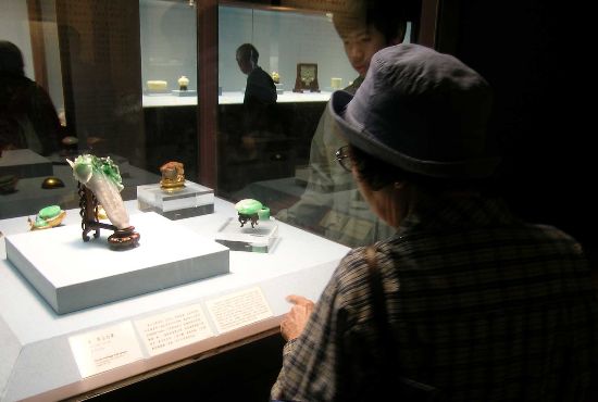 资料图:两位游客正在台北故宫博物院观赏国宝“翠玉白菜”。