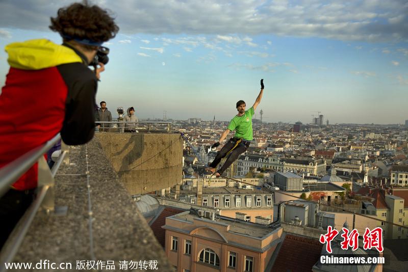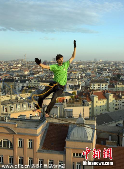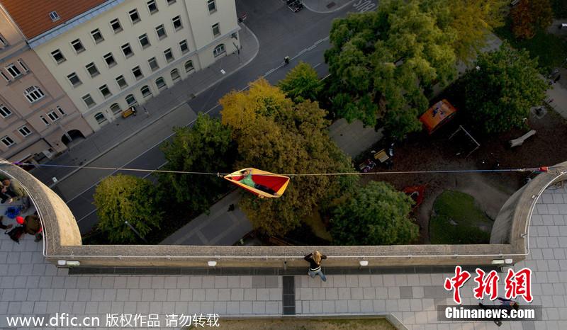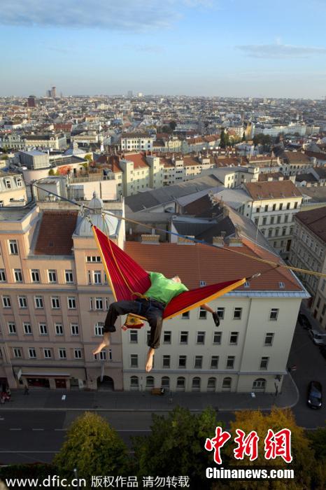 当地时间2014年1月报道,睡吊床是一件十分惬意休闲的事情,不过这个距离地面100英尺的高空吊床却只能用毛骨悚然来形容!冒险家Igor Scotland在奥地利维也纳离地100英尺的空中拉起钢丝绳挂起一张吊床,并在吊床中休息和睡觉,向自己的胆量极限发起挑战,吸引了大批市民驻足观看,不少围观者都为他捏把汗。不过斯科兰特本人却悠然自得,不仅静静享受脚下的维也纳风光,还不时在钢丝绳上表演高超的技艺。图片来源:东方IC 版权作品 请勿转载