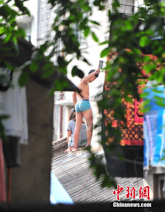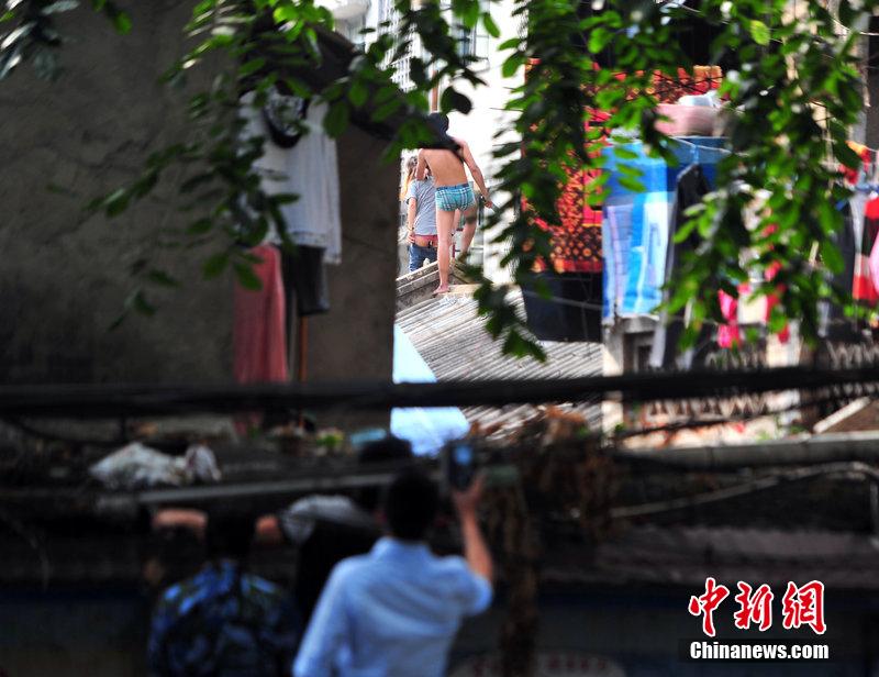 当天下午15时许,在一居民楼楼顶上,一名半裸男子手里拿着一把菜刀,揪着一名半裸女子的头发,男子情绪异常激动,不停地挥舞手中的菜刀。当时现场已被警方封锁,数百名市民围观。