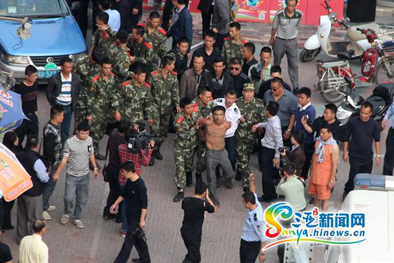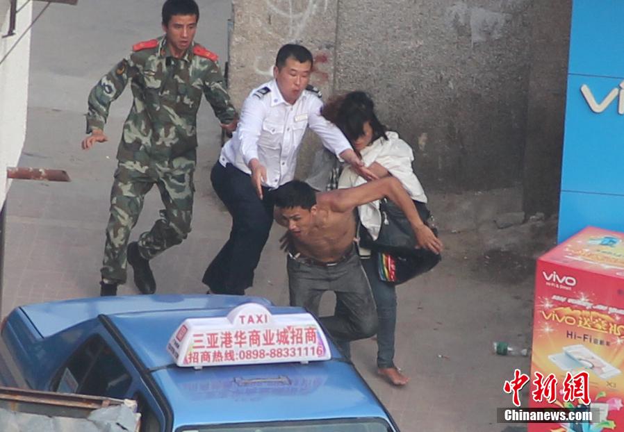 1月20日,位于三亚市建设街附近有一名半裸男子,手拿菜刀挟持了一名半裸女子。目前,该名男子已被警方控制,具体挟持原因正在进一步调查之中。马伟元 摄 图片来源:三亚新闻网
