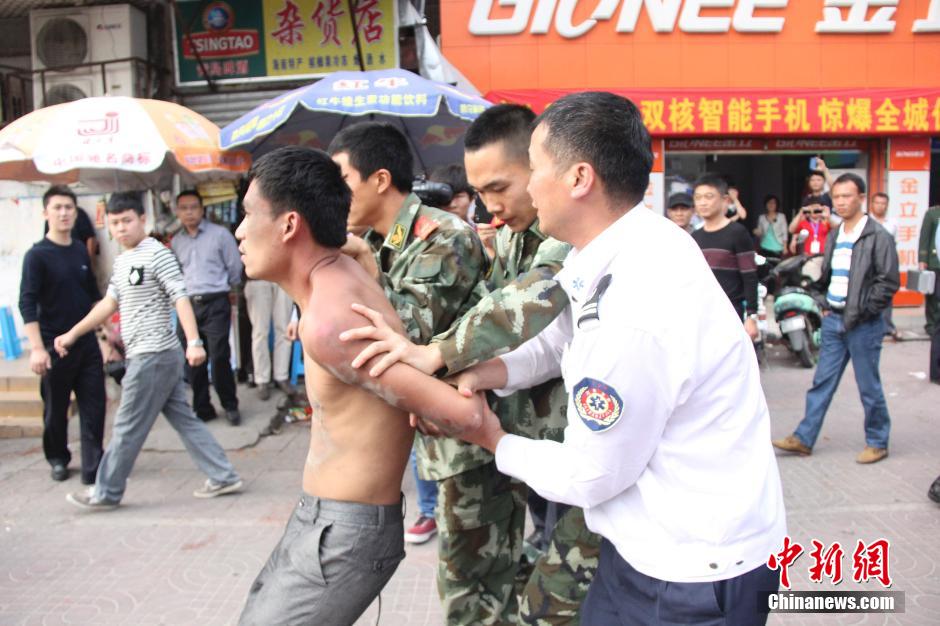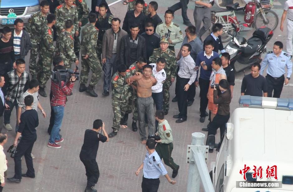 1月20日,海南省三亚市解放二路发生一起劫持人质案件。警方经过近5个小时的周旋,制服劫持人质的持刀男子,成功解救被劫人质,人质安然无恙。图为男子被警方制服。中新社发 周君 摄