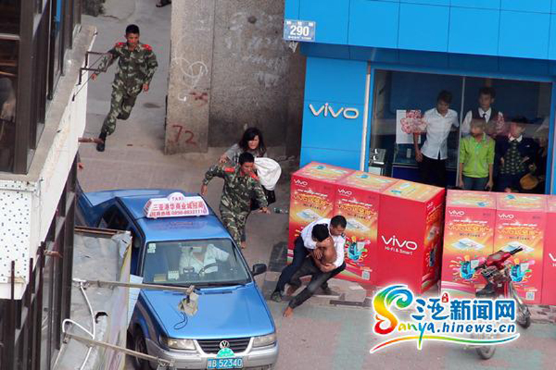 1月20日,海南省三亚市解放二路发生一起劫持人质案件。警方经过近5个小时的周旋,制服劫持人质的持刀男子,成功解救被劫人质,人质安然无恙。中新社发 周君 摄