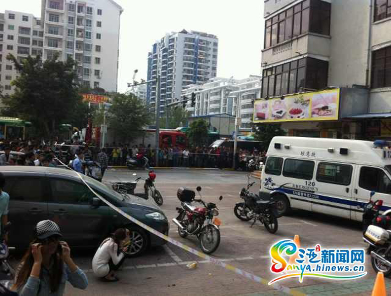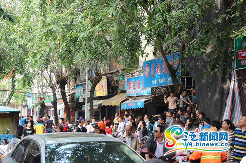 1月20日,位于三亚市建设街附近有一名半裸男子,手拿菜刀挟持了一名半裸女子。目前,该名男子已被警方控制,具体挟持原因正在进一步调查之中。图为围观的市民。马伟元 摄 图片来源:三亚新闻网