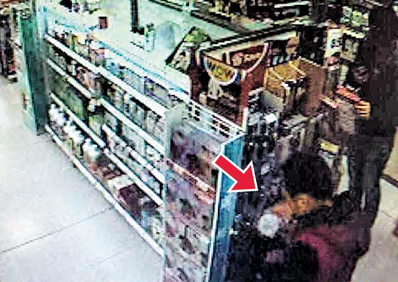 帮凶杨某负责(箭头处)剪去商品外包装,并让爱美的男大学生张某站在一旁把风。翻拍自监视器画面