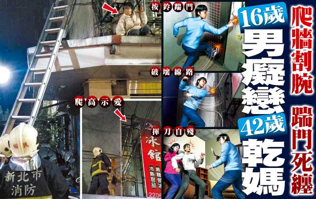 中国台湾网2月11日消息 据台湾媒体报道,新北市一名16岁少年疯狂爱上比他母亲还大两岁的42岁干妈,住进她家,导致干妈夫妻失和离婚;两人在外同居1个月后,干妈向前夫求和返家,不料少年不断到干妈家楼下踹门、按门铃,甚至攀爬楼墙、割腕自残。只为见对方一面,警消获报前往处理即有20次。前天寒流来袭,少年两度冒雨攀墙求见,警消到场见又是熟面孔,不禁摇头说:“怎么又是你!”(点击查看少年爬墙踹门组图)