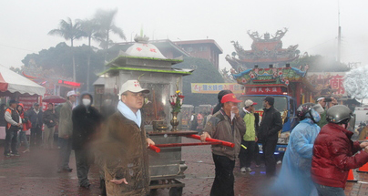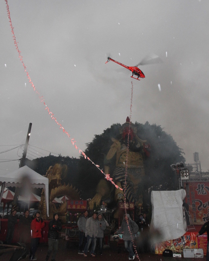 中国台湾网2月13日消息 据台湾媒体报道,为期2天2夜的元宵节台南盐水蜂炮,于今日上午8时在盐水武庙正式启炮。不过因为下雨,直升机启炮作业并不顺利,直升机飞到半空中鞭炮突然熄火,3度经由工作人员点燃后仍熄火,最后只好作罢。