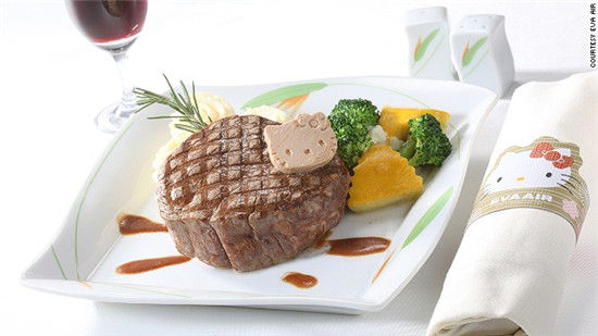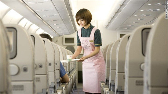 进入舱门,飞机内有100多个Hello Kitty的图案,分别印于头枕罩、纸巾、餐具、小吃和肥皂等。当你用卫生纸时,上面印有Hello Kitty。拆开坚果袋之前,也会看到 Kitty。机上乘务人员身穿Hello Kitty围裙,销售Kitty品牌限量免税商品。乘客上机之前,就已沉浸在Hello Kitty的世界中。(中国台湾网 高旭)