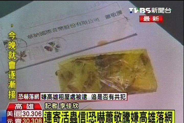 这名赖姓嫌犯落网后,初步坦承寄发20多封恐吓信,昨天被警方在高雄市三民区的租屋处逮捕。赖男在警讯时坦承因不满警方查办他女友涉嫌违反商标法案,才寄发恐吓信,企图发泄不满和扩大效应。至于有没有共犯,警方还在调查当中,而这名赖姓嫌犯,目前已经在押送到台北刑事局的途中。