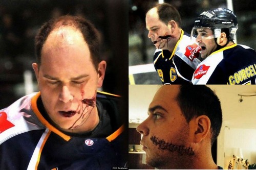 在北美的冰球赛场上,在激烈的比赛进行中,冰鞋上的刀口不小心滑到了运动员库尔塞勒斯的脸,顿时血流如注