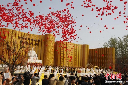 4月2日上午,乐舞祭拜人文始祖黄帝。当日,甲午年黄帝故里拜祖大典在新郑市黄帝故里景区举行。大典沿承规制,共有“敬献花篮”“净手上香”“祈福中华”“高唱颂歌”等九项仪程。中新社发 王中举 摄