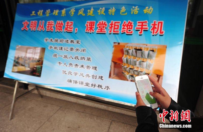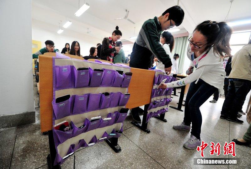 4月03日,在洛阳理工学院工程管理系教室,学生们自愿将手机放入贴有自己姓名的手机收纳袋中。图片来源:CFP视觉中国