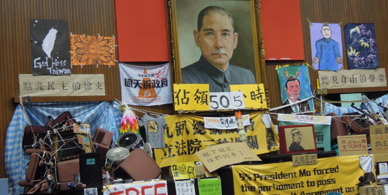学生占据议场期间,主席台上摆满标语旗帜。(台媒图)