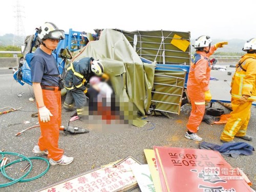 “吓死了,转陀螺一样,车内的人一一掉出来!”目击的驾驶人说,因翻滚力道太大,车上7人甩出车外,只有车斗内1人被尼龙绳缠住未弹出,其中3人在擦撞瞬间弹落车道,4人于车体在空中翻滚时被抛出车外,摔落北上车道。