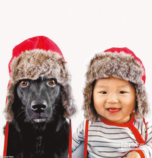 据台湾《中国时报》报道,台湾流浪狗柔伊(Zoey)萌照跃上国际媒体。美国女摄影师葛瑞斯7年前认养柔伊,日前将它与10个月大的儿子杰士伯打扮相同造型一起入镜,真像是“人狗双胞胎”。