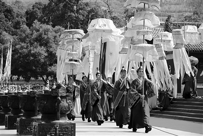 6月22日,2014(甲午)年公祭中华人文始祖伏羲大典在甘肃天水伏羲庙举行,海内外两万余人士参加大典;同一时刻,台湾嘉义市大天宫也在进行公祭伏羲活动,台湾政要和各界代表5000人参加祭祀。两岸还互派交流团参祭。 图为天水公祭伏羲现场。