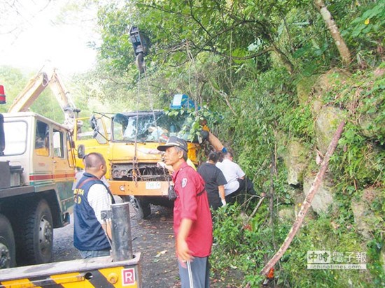 据报道,失事的是台湾电力公司重达21吨的外包工程车,车辆刹车失灵后,在重力加速度下猛烈撞击山壁,使得轮胎陷入排水沟,动弹不得,车头严重变形,司机陈炳鑫被卡在司机座上,他的2名同事则仅受轻伤。