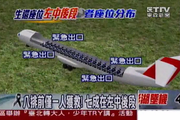 10名生还者中,7人坐在飞机左侧后段。(图片来源:台湾东森新闻)
