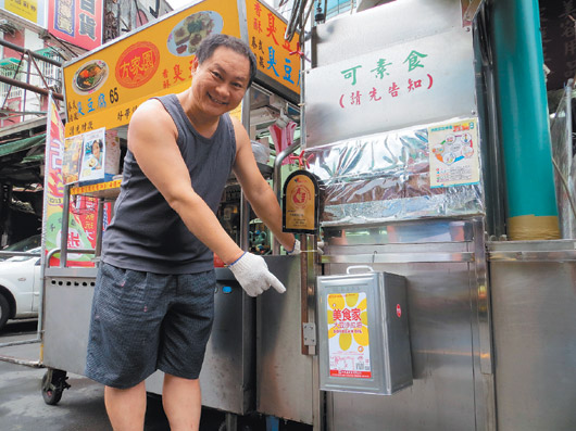 为让民众安心消费,新北市乐华夜市这家臭豆腐店家一开市就把油桶挂出来,告诉消费者“我家没用馊水油!” 来源:台湾《联合报》