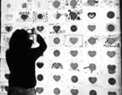 图为展览现场特别展出了香港艺术家文晶莹策划的“一人一心”艺术创作。800多幅来自台湾、香港、日本、韩国和英国民众的作品,以不同语言写着“日本政府请道歉”、“用爱抚平伤痛”等,希望能用和平的方式发声。