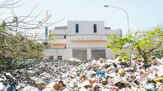 屏东县琉球乡的焚化厂闲置多年未用,垃圾全运到屏东处理,因为没有经费运送,全乡垃圾从1月开始就没去处,全堆放在闲置的焚化厂对面空地,已堆积成垃圾山。 图自台湾《联合报》