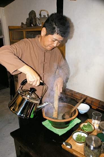 擂好的茶缓缓注入滚水,香气窜鼻。图自台湾《联合报》