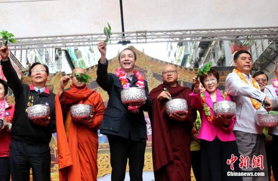 4月12日,新北市长朱立伦(左三)、台“立法院”副院长洪秀柱(右二)出席新北市泼水节,参与“洒净去厄”活动。中新社发 陈小愿 摄