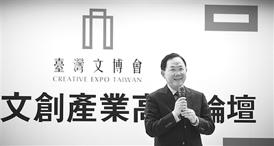 “两岸文创产业高峰论坛”5月4日在台北召开,近200名学者和业内人士就两岸文创产业环境与合作模式、知识产权保护进行了探讨和交流,以携手把握全球文创产业商机。图为主办方之一中华两岸文化创意产业发展协会理事长丁守中致辞。新华社记者 才 扬摄