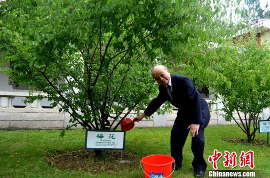 叶昌桐将军为梅花浇水。 陈惠端 摄